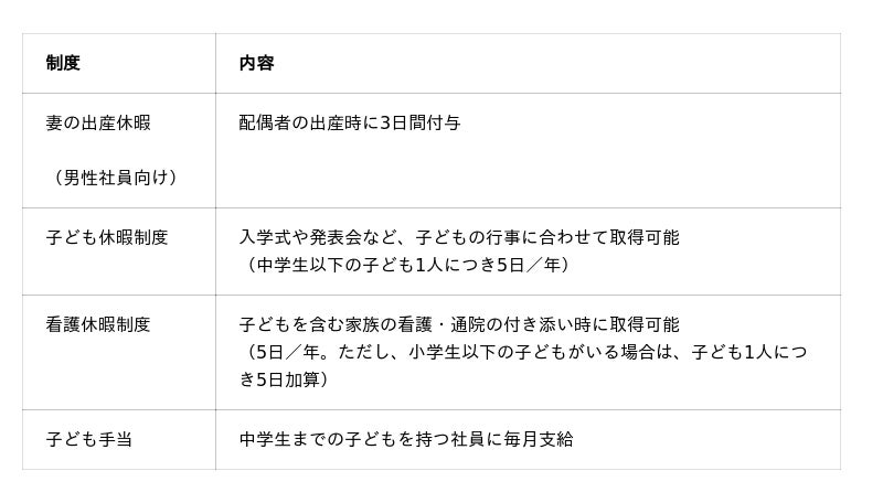 インターグでは、育児を出産直後だけでなく子どもの成長に寄り添いながら継続的に支援することを重視しています。柔軟に働き続けられる職場づくりを目指し、産育休のほか、リモートワークやフレックスの活用推進はもちろん、以下のような制度を整えています。(男女問わず利用可能)