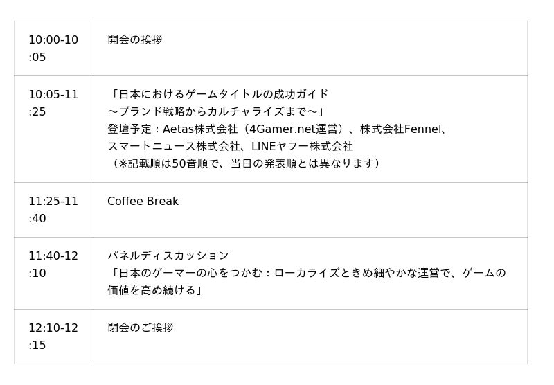 本セミナーでは、日本のゲーム市場の最新動向や効果的な進出戦略について、ローカライズやマーケティング・プロモーションの具体的な事例を交えながらご説明いたします。日本のゲーム業界を支える多彩なキーパーソンである、総合ゲーム情報サイト「4Gamer.net」の編集長でAetas株式会社 代表取締役社長の岡田和久氏、プロeスポーツチームFENNELを運営する株式会社Fennel エンターテイメント事業部 事業部長の石川龍平氏、スマートニュース株式会社 Head of APAC Ad Business/SmartNews Singapore Pte. Ltd. CEOのBi Wu(ビ・ウ)氏、LINEヤフー株式会社 第二ビジネスコンサルティング本部 コンサルティング3チームの藤友康臣氏、による実践的なお話を直接聞ける貴重な機会となりますので、参加をご希望の方は、下記よりお申し込みください。