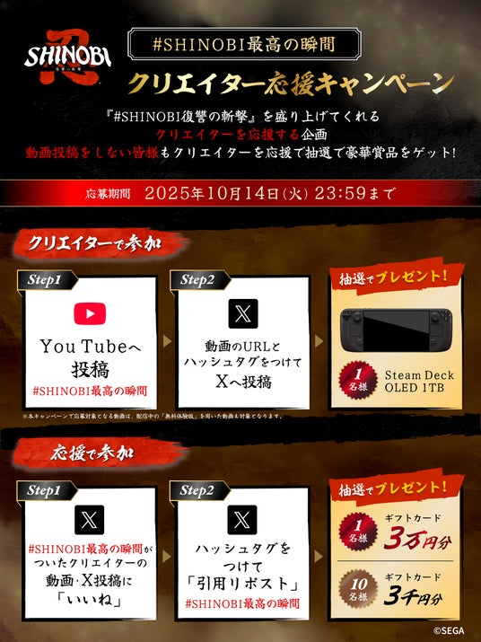 現在、『SHINOBI 復讐の斬撃』の参加型企画「#SHINOBI最高の瞬間」クリエイター応援キャンペーンを開催中です。本キャンペーンでは、YouTubeに本作の“最高の瞬間”を投稿していただいたクリエイターの方や、その動画を応援してくださる方を対象に、抽選で豪華賞品をプレゼントします。