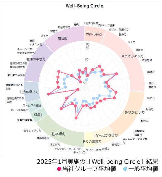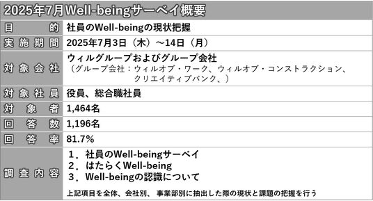株式会社ウィルグループ(本社:東京都中野区、代表取締役社長 角 裕一)は、「個と組織をポジティブに変革するチェンジエージェント・グループ」をミッションとして掲げ、2019年から社員のWell-beingを高めることを重視し活動しています。今回のWell-being活動レポートVol.7では、役員を含めた総合職社員に実施している幸福度診断『Well-Being Circle』(以下、Well-beingサーベイ)の最新結果(2025年7月実施)をご報告いたします。