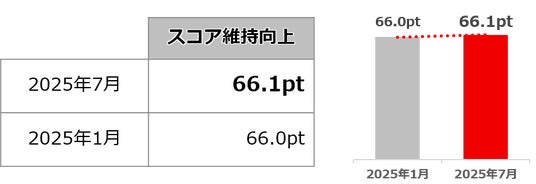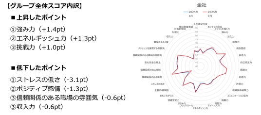 Well-beingサーベイの目標値として、1.社員のWell-beingスコアの低下者率31.2%以下(昨年同様)と2.グループ全体のWell-beingスコア上昇の2つを掲げていますが、2025年7月実施の結果では、1.低下者率は29.0%で前回実施(2025年1月)時点から3.1%向上、2.グループ全体のWell-beingスコアは66.1ポイントで前回実施時点から0.1ポイント増加となり目標値に対してどちらも達成進捗となりました。一部のスコアの内訳では「強み力」「エネルギッシュ力」「挑戦力」が上昇した一方で、「ストレスの低さ」「ポジティブ感情」「信頼関係のある職場の雰囲気」「収入力」が低下したことが結果としてわかりました。<結果>(2025年1月と2025年7月の比較)