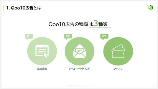 Qoo10広告には「広告掲載」「メールマーケティング」「クーポン」の3種類があります。