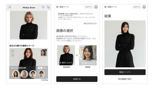 FaceChangeは、ECサイトにおいてユーザーが検討中の洋服が自分に似合うかどうかを確認し、安心して購入できる体験を提供するサービスです。本サービスを利用することで、ECサイト上の着用モデルやスタッフ画像を、ユーザー自身の髪型や雰囲気に近いモデルやユーザー自身の顔に差し替え、着用時のイメージを確認できます。