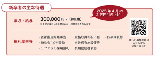 「優秀な人材の確保と育成」に基づき、2025年4月より新卒初任給を30万円(固定残業代7万5千円含む)とするなど積極的に若年層活躍の支援をしております。