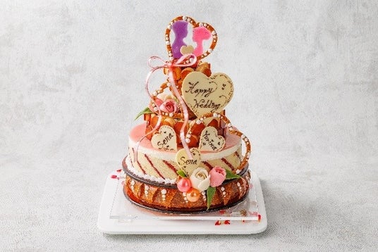高校生パティシエ日本一の栄光をつかんだ「Eclat fiere」は、クロカンブッシュを主体としたウィデングケーキ「Gratibelle(グラティベル)」を制作。あめ細工の新郎新婦やハート形のプレートなどを巧みに使って演出。結婚式にふさわしい感謝や幸福といったコンセプトを表現しました。