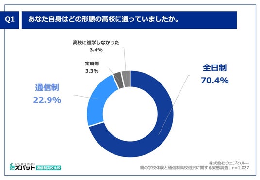 はじめに、今回のアンケート対象者である「通信制高校に通った経験のある子供(卒業済み・在学中を含む)を持つ親」1,027名に「Q1. あなた自身はどの形態の高校に通っていましたか。」(n=1,027)と質問したところ、「全日制」が70.4%、「通信制」が22.9%という回答となりました。
