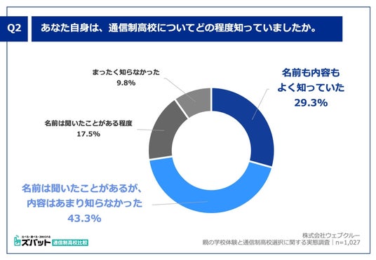 次に「Q2. あなた自身は、通信制高校についてどの程度知っていましたか。」(n=1,027)と質問したところ、「名前も内容もよく知っていた」が29.3%、「名前は聞いたことがあるが、内容はあまり知らなかった」が43.3%という回答となりました。