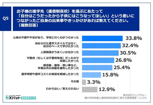 Q4で、親自身の学生時代の経験が「大いに影響を与えた」「ある程度影響を与えた」と回答した方に、「Q5. お子様の進学先(通信制高校)を選ぶにあたって『自分はこうだったから子供にはこうなってほしい』という思いにつながったご自身の出来事やきっかけがあれば教えてください。(複数回答)」(n=272)と質問したところ、「心身の不調や不安があり、学校に行くのがつらかった」が33.8%、「決められた通学スタイルではなく、自分のペースで学びたかった」が32.4%、「人間関係がうまくいかなかった」が30.5%で、上位を占めました。親自身のさまざまな経験をふまえつつ、「子供には後悔させたくない」という思いのもとで子供を通信制高校へと送り出している様子が見てとれます。