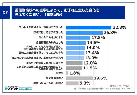 「Q7. 通信制高校への進学によって、お子様に生じた変化を教えてください。(複数回答)」(n=1,027)と質問したところ、「ストレスが軽減され、精神的に安定した」が32.8%、「学校に行けるようになった」が26.8%、「気の合う友達ができた」が17.8%という回答となりました。
