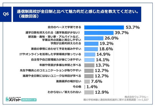 「Q6. 通信制高校が全日制と比べて魅力的だと感じた点を教えてください。(複数回答)」(n=1,027)と質問したところ、「自分のペースで学習できる」が53.7%、「通学日数を抑えられる(通学負担が少ない)」が39.7%、「部活動・趣味・習い事・アルバイトなど、学業以外の活動と両立しやすい」が26.0%と上位を占めました。