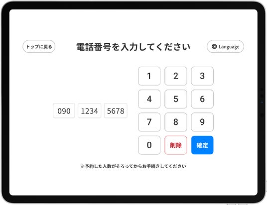 面会者が、院内タブレットで「入館/退館」を選び、電話番号を入力します。