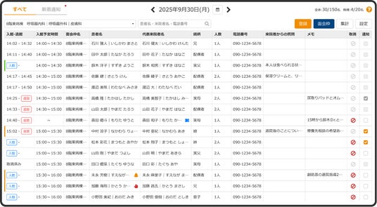 朝の情報収集時点で1日の来訪が一覧化され、処置や検査とのバッティング回避が容易。