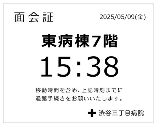 登録情報が照合されると、面会証シールが自動印刷されます。シールには退館予定時刻が自動計算で印字されるため、面会者に対する時間意識づけや、スタッフによる声かけの削減に有効です。