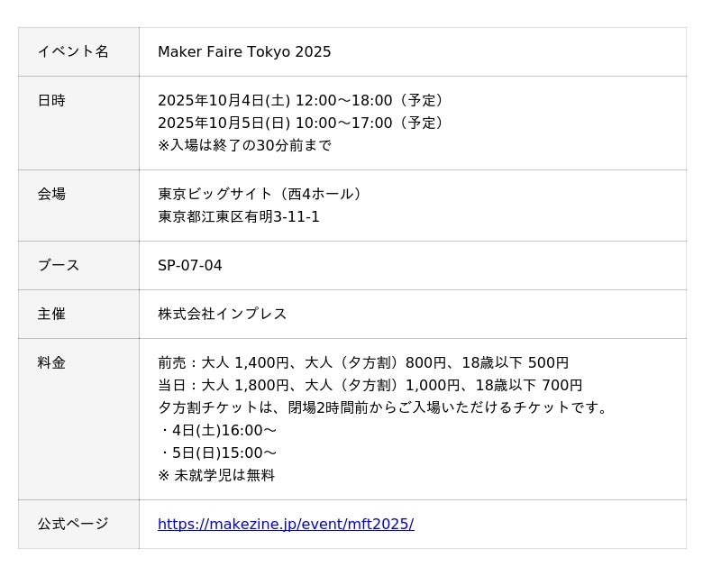 APPLE TREE株式会社(所在地:大阪府大阪市、代表取締役社長:朴 秀明)は2025年10月4日(土)・5日(日)に東京ビッグサイトで開催される「Maker Faire Tokyo 2025」に出展いたします。