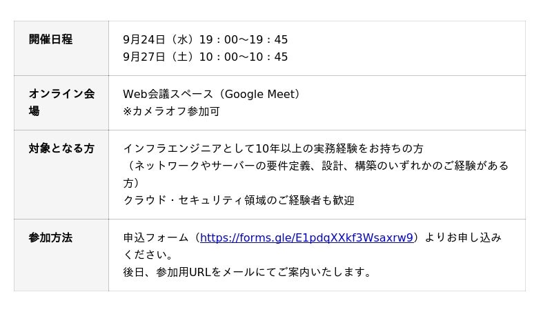 株式会社アイエスエフネット(本社:東京都港区/代表取締役:渡邉幸義、以下アイエスエフネット)は、シニア世代のITインフラエンジニアを対象としたオンライン採用説明会を、9月24日(水)と27日(土)に開催いたします。