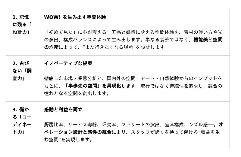 designspiritsが再始動にあたり掲げるテーマは、「感動」「収益性」「持続可能性」のすべてを同時に叶える店舗空間づくりです。