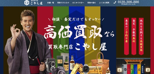 こやし屋は、リユース業界大手の株式会社トリアイナが運営する買取専門店です。カメラ、骨董品、お酒、ブランド品などの買取を行っています。