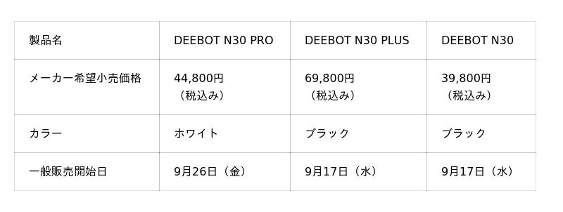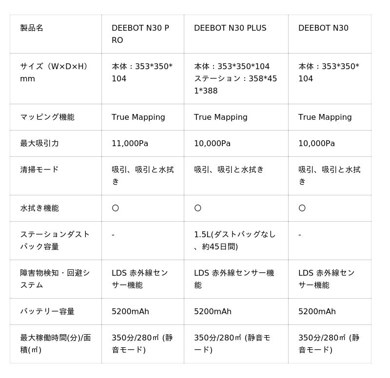 N30:https://www.ecovacs.com/jp/deebot-robotic-vacuum-cleaner/deebot-n30-black
