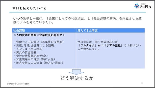 セミナーは、『上場企業と取り組む、経済的格差の是正への挑戦』と題して開催され、「企業にとっての利益創出」と「社会課題の解決」を両立させる連携モデルについて、CFO協会会員の皆さまに向けて講演を行いました。岡村はSuFIAの掲げる理念や日本の労働市場の現状と課題について、宮地は多様な就労形態を可能にするエコシステムの構築やその過程で直面する様々な課題ついて述べました。