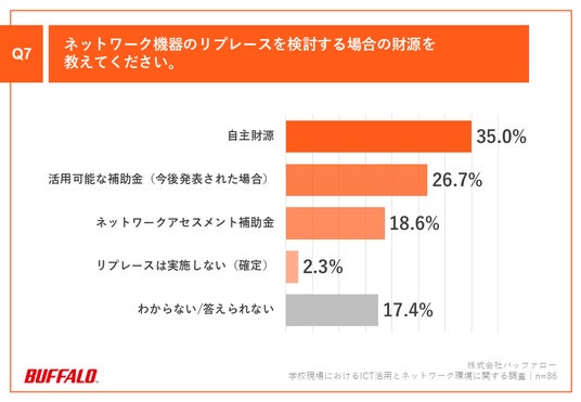 「Q7.ネットワーク機器のリプレースを検討する場合の財源を教えてください。」(n=86)と質問したところ、「自主財源」が35.0%、「活用可能な補助金(今後発表された場合)」が26.7%、「ネットワークアセスメント補助金」が18.6%という回答となりました。
