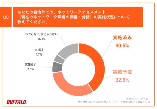 「Q8.あなたの自治体での、ネットワークアセスメント(現在のネットワーク環境の調査・分析)の実施状況について教えてください。」(n=86)と質問したところ、「実施済み」が40.6%、「実施予定」が32.6%という回答となりました。