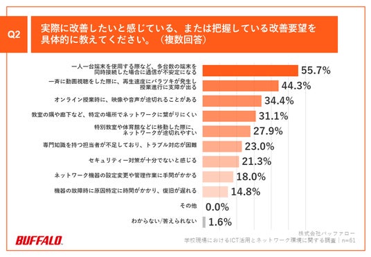 Q1で「ある」と回答した方に、「Q2.実際に改善したいと感じている、または把握している改善要望を具体的に教えてください。(複数回答)」(n=61)と質問したところ、「一人一台端末を使用する際など、多台数の端末を同時接続した場合に通信が不安定になる」が55.7%、「一斉に動画視聴をした際に、再生速度にバラツキが発生し授業進行に支障が出る」が44.3%、「オンライン授業時に、映像や音声が途切れることがある」が34.4%という回答となりました。