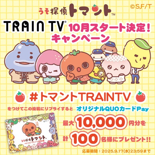 うそ探偵トマント公式Xアカウントをフォロー&指定の投稿に「#トマントTRAINTV」をつけてリプライすると、限定デザインのQUOカードPay最大10,000円分が計100名様に当たります!