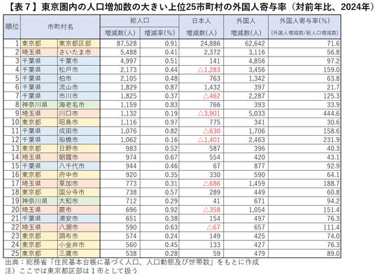 ここで、人口増加数が多い上位25市町村(ここでは東京都区部は1市として扱う)について日本人・外国人別の増減数をみると、最も人口増加数の多い東京都区部8万7,528人のうち外国人増加数は6万2,642人(外国人寄与率71.6%)、2位のさいたま市5,488人のうち外国人増加数は3,116人(56.8%)、3位の千葉市4,997人のうち外国人増加数は4,856人(97.2%)で、いずれも外国人増加数が全体の過半数を占めています。また、松戸市(外国人寄与率159.0%)、市川市(125.3%)、川口市(444.6%)、成田市(158.6%)、船橋市(231.9%)、草加市(188.7%)、蕨市(151.4%) 等では、日本人の減少を上回る数で外国人が増加し、外国人寄与率が極めて高い状況になっています【表7】。