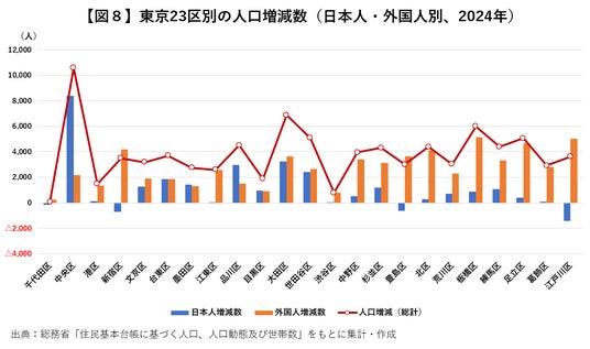 外国人の動向に着目すると、増加数では板橋区(5,130人)、江戸川区(5,014人)、足立区(4,665人)、新宿区(4,200人)、北区(4,109人)の順に多く、増加率では中央区(21.05%)、杉並区(16.22%)、中野区(16.12%)、板橋区(15.86%)、北区(15.02%)の順に高くなっており、これまで外国人が比較的多かった区以外でも増加率が高まっている状況がみてとれます【表8】。