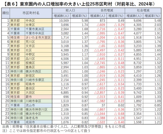 2024年の人口増加率の上位25市区町村をみると、東京都中央区(5.98%)を筆頭に、台東区(1.74%)、千葉市美浜区(1.68%)、千葉市中央区(1.44%)さいたま市大宮区(1.37%)、東京都荒川区(1.37%)、文京区(1.36%)、北区(1.23%)の順に高く、横浜市西区(1.00%)も13位に付けています。ただし、これら上位25市区町村のうち、自然増となっているのは1位の東京都中央区(自然増873人)、21位の流山市(自然増37人)の2つのみで、多くの市区では社会増によって人口増加が達成されていることがみてとれます【表6】。