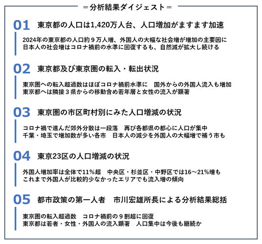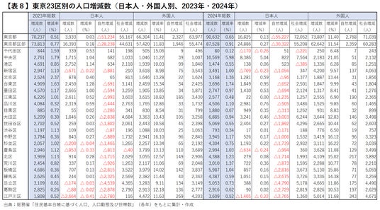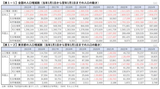 ・2024年の東京都の人口約9万人増、外国人の大幅な社会増が増加の主要因に・日本人の社会増はコロナ禍前の水準に回復するも、自然減が拡大し続ける