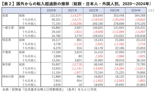 東京都の転入超過数は総数7万2,795人で、日本人は2,011人の転出超過、外国人は7万4,806人の転入超過、東京圏(一都三県)の転入超過数は総数15万5,431人、日本人は4,207人の転出超過、外国人は15万9,638人の転入超過となっています。外国人の転入超過数でみると、東京都は全国の約20.0%、東京圏は全国の約42.7%を占め、国外から東京都もしくは東京圏に多くの外国人が流入している状況となっています【表2】。