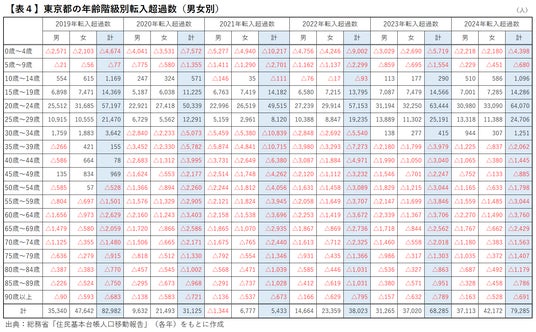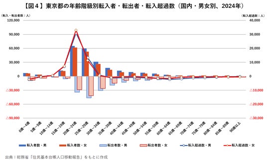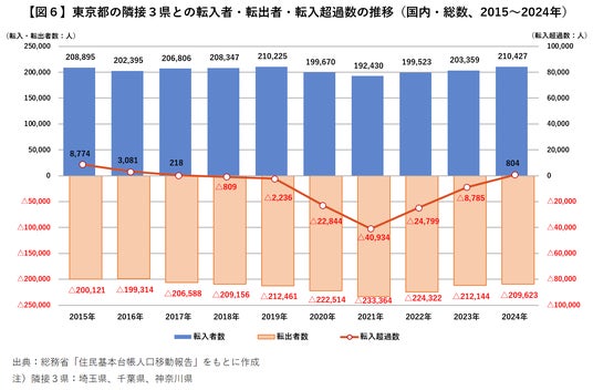 東京都からの転出超過は埼玉県のみ、隣接3県から東京都へ若年層の流入拡大