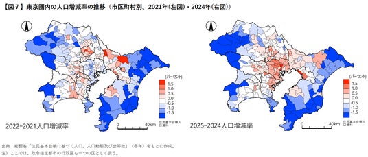 コロナ禍の2021年は東京都区部から隣接3県への転出や外国人の国外への転出により、東京都区部の多くの区で人口が減少。東京都心からおおむね30km圏の市(さいたま市、流山市、印西市、横浜市、川崎市、海老名市)や藤沢市、茅ヶ崎市等で人口が増加する「郊外分散」の現象が起こりましたが、2024年は各都県の都心部に再び人口が増加する「都心集中」の状況となっています【図7】。