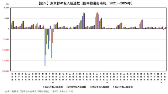 東京都と各道府県との転入・転出状況をみると、2024年に東京都から転出超過となったのは、埼玉県(2,827人の転出超過)のみで、昨年の転出超過から転入超過に転じた千葉県(1,527人の転入超過)、神奈川県(2,104人の転入超過)を含め、他の道府県はすべて転入超過となっています。2020年以降、東京都から隣接3県へ大きく転出超過が続いていた状況も収まりつつあるようです【図5】。