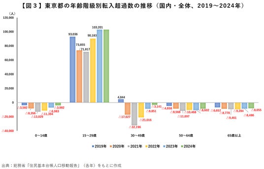 これを、子ども層(0~14歳)、若年層(15~29歳)、青壮年層(30~49歳)、熟年層(50~64歳)、高齢層(65歳以上)に分けて推移をみると、若年層の転入超過数(10万3,062人)は2023年と同様にコロナ禍前よりも1万人ほど上回っています。青壮年層の転出超過数(3,141人)、子ども層の転出超過数(3,982人)とも2022年以降大きく縮小しており、コロナ禍で拡大していた「子育て層」(30~49歳代+子ども層)の転出超過はほぼ収まってきたと言えます【図3】。