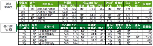 街の幸福度ランキングは、 「全体としてみて、あなたは現在、幸せですか、あるいは不幸せですか」に対して、 1点(非常に不幸)から10点(非常に幸福)までの10段階で評価してもらい、その回答の平均値を10倍して、100点満点に換算。住み続けたい街ランキングは、「今住んでいる街に、ずっと住んでいたいと思う」に対して、 「そう思う」:100点から「そう思わない」:0点までの5段階評価をしてもらい、その回答の平均値で作成。「誇りがある」「愛着がある」も「住み続けたい街ランキング」と同様の方法で作成。