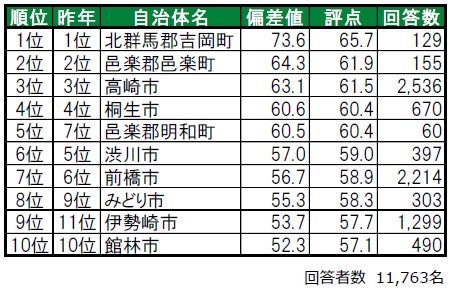 住み続けたい街1位は4年連続で北群馬郡吉岡町。2位と3位は2年連続で、2位邑楽郡邑楽町、3位高崎市。