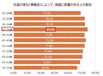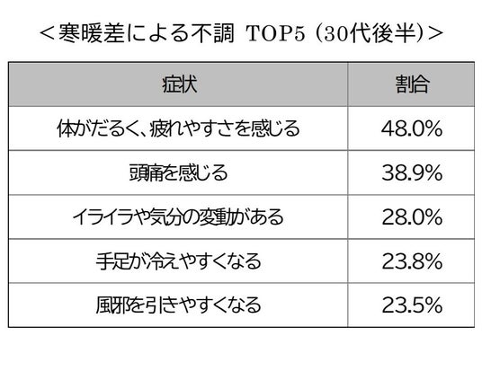 l 寒暖差による不調は30代後半が最も実感/「だるさ・疲れやすさ」や「頭痛」が多い傾向に