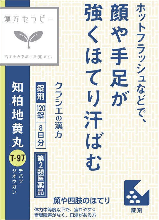 主にホットフラッシュなどによる顔や手足のほてりに用いられる処方です。年齢と共に減少した「腎精※」を補う働きがあるので、排尿困難、頻尿にも効果があります。特に、ほてり、口渇、むくみのある方におすすめです。