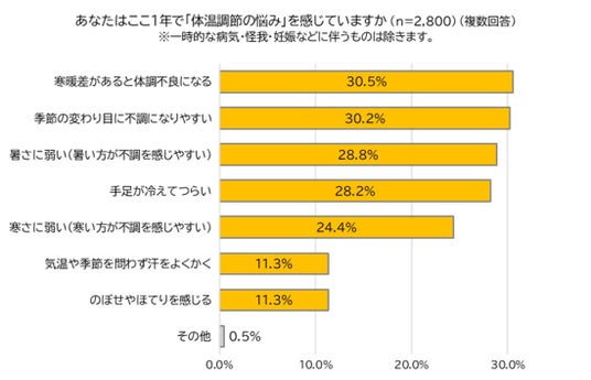 ここ1年の「体温調節の悩み」について尋ねたところ、72.1%の人が何かしらの「体温調節の悩み」を感じていることが明らかになりました。また、具体的な症状についてみると、約3割の人が「寒暖差があると不調になる」(30.5%)や「季節の変わり目に不調になりやすい」(30.2%)といった不調を抱えていることがわかりました。