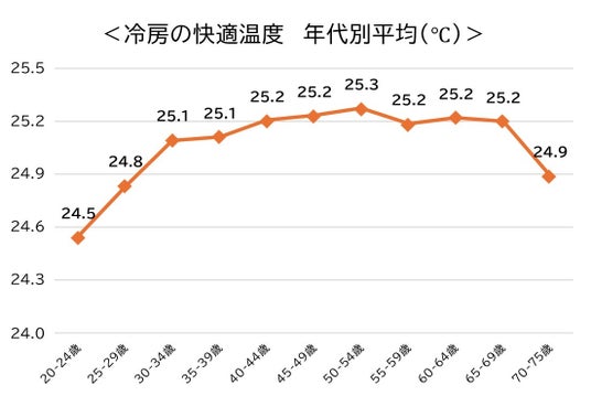 また、快適温度は20代から急激に上昇し、30代以降ゆるやかに上昇することから、30代以降は冷房の冷たさを感じやすくなり、設定温度を高めにする傾向があると考えられます。