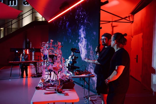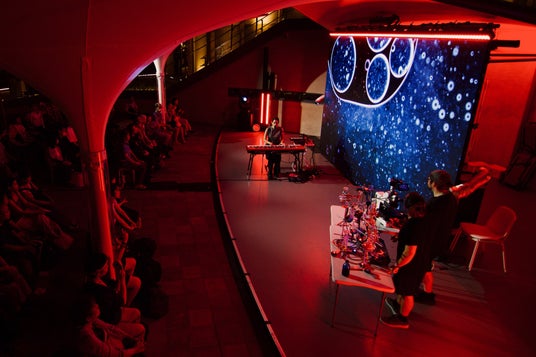 ドイツ館のステージには、顕微鏡や液体の入ったグラス、キーボードなど独特な装置が並び、非日常的な雰囲気に包まれました。ピアニスト兼作曲家 Sofi Paez による幻想的な歌声で幕を開けたステージ。アーティスト集団 Magnificent Matterが、ZEISSの最新モデル「ZEISS Axioscope 7」を通して、多様な液体がリアルタイムに混じり合う様子をスクリーンに映し出します。ピアノの旋律とともに流れの速さを変える液体は、時に宇宙の銀河のように、時に血液や川の流れのように姿を変え、観客を圧倒しました。