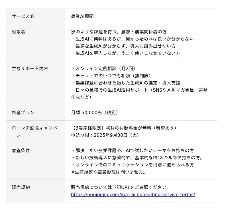 農業コンサルティング事業を展開する「株式会社農情人(本社:千葉県船橋市、代表取締役:甲斐雄一郎)」は、農業コンサルタントがAI導入を成功に導く伴走型支援サービス「農業AI顧問」を正式にリリースしたことをお知らせします。本サービスは、「AIに興味はあるが、どのツールを選べば良いか分からない」「導入してみたが使いこなせない」といった農家の悩みを解決するため、農業と新技術に精通したコンサルタントが、適したAIの選定から導入、日々の業務への活用定着までを月額5万円で一貫してサポートするものです。サービスのローンチを記念し、3農家限定で「初月無料キャンペーン」を実施いたします。