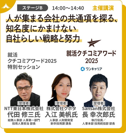 概要 :就活クチコミアワードにて学生から高い評価を獲得した受賞企業であるNTT東日本、クボタ、Sansanの採用責任者が登壇します。それぞれの企業が知名度にかまけず “人が集まる会社”となるために現場で積み重ねてきた、自社らしい採用戦略や候補者体験向上の工夫、その努力を深掘りします。