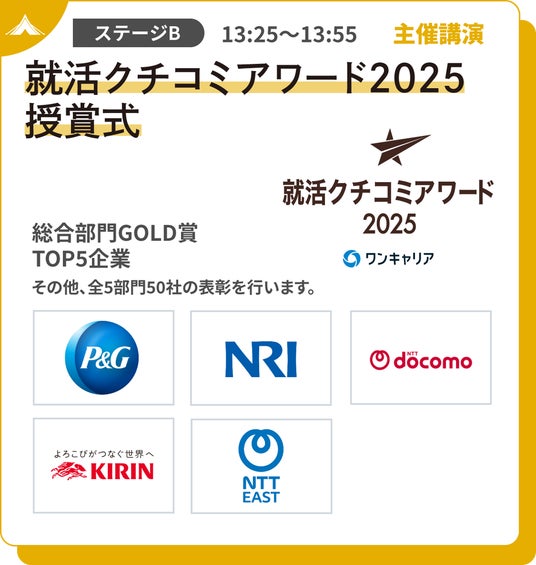 例年は都内で開催していた受賞企業への表彰イベントを、今年は「採用ウルトラキャンプ」内で開催します。就活クチコミアワードの各部門における最高ランクであるGOLDを獲得した3社をお迎えする特別セッションでは、就活生に支持されるために各社が行なっている“採用の工夫”について伺います。また、同アワードの受賞企業50社への授賞式も開催します。<詳細>