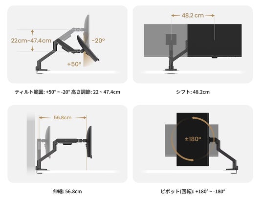 上下は-20°~50°のティルト、左右は±90°のスウィーベル、画面回転は±180°まで対応し、シーンに合わせてモニターを自在に動かせます。モニターの高さを上げて姿勢を整えたり、用途に合わせて縦画面に切り替えたりと、作業スタイルに合わせた快適なポジションに調整できます。さらにピボットは180°/360°の2Way設置に対応しており、壁に当たって傷つく心配もありません。内蔵スプリング機構によって、モニターを好きな角度でしっかり固定できるため、動かすたびに安定した操作感を得られます。