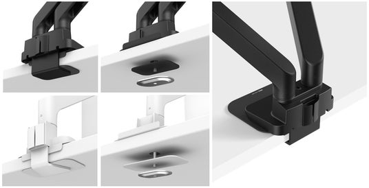 両製品とも、最大20kgまでのモニターを安定して支える高耐荷重設計により、通常のオフィス用モニターからウルトラワイドモニター、ウェブカメラやスクリーンバーを取り付けた状態でも安心して使用できます。上下・左右・回転の広い可動域を備えており、モニターの高さを調整したり、用途に応じて縦画面に切り替えたりと、作業スタイルや姿勢に合わせて快適なポジションを実現します。また、対応デスク厚は12~50mmと幅広く、クランプ固定とグロメット固定の両方に対応。補強プレート付きで、薄型やガラス天板でも傷やたわみを気にせず設置でき、オフィスや在宅環境などさまざまなデスクで快適に使用できます。