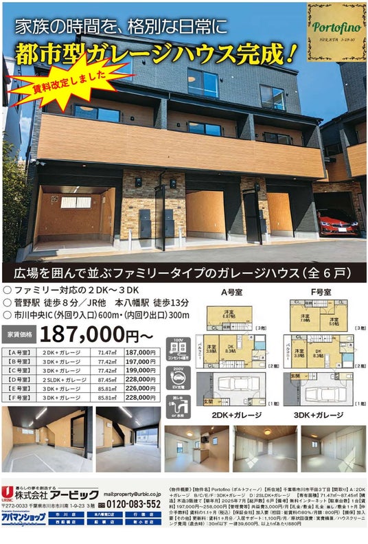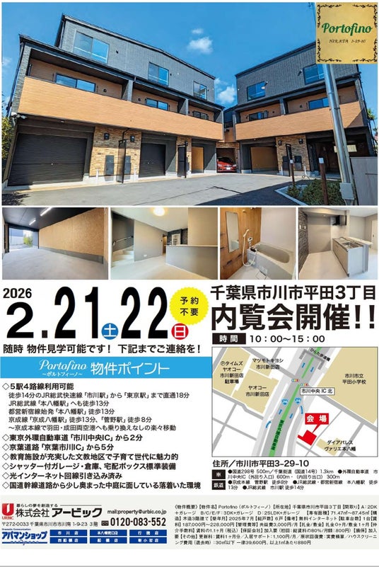 外環道「市川中央IC」から600m・約2分、JR総武線・都営新宿線「本八幡」、京成線「菅野」「京成八幡」など5駅4路線が利用可能な交通至便の地に賃貸ガレージハウス「Portofino(ポルトフィーノ)」が堂々完成しました。この度、賃貸募集の開始に伴い現地完成見学会を実施いたします。外環道側道から少し奥まった中庭を囲んで佇む、落ち着いた雰囲気のインナーガレージ付き3階建て(一部2階建て)の6世帯。平田・菅野地区は教育施設が整った歴史ある文教地区にあって、都心方面への通勤・通学や買い物など生活利便性の高いエリアとなっております。ビジネス・レジャーの拠点としても最高のロケーションとクオリティを、この機会にぜひ現地でお確かめください。