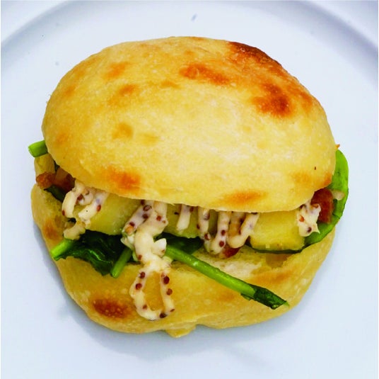 男爵いもをメイン食材に使用し、秋の旬食材であるキノコと合わせたマッシュポテトをデュラム生地でサンドしました。アクセントに角切りジャガイモと厚切りベーコンも挟むことで、食感にも彩りを加え、粒マスタード・牛乳・グリュイエールチーズを合わせた自家製ソースとチェダーチーズで深みある味わいに仕上げました。